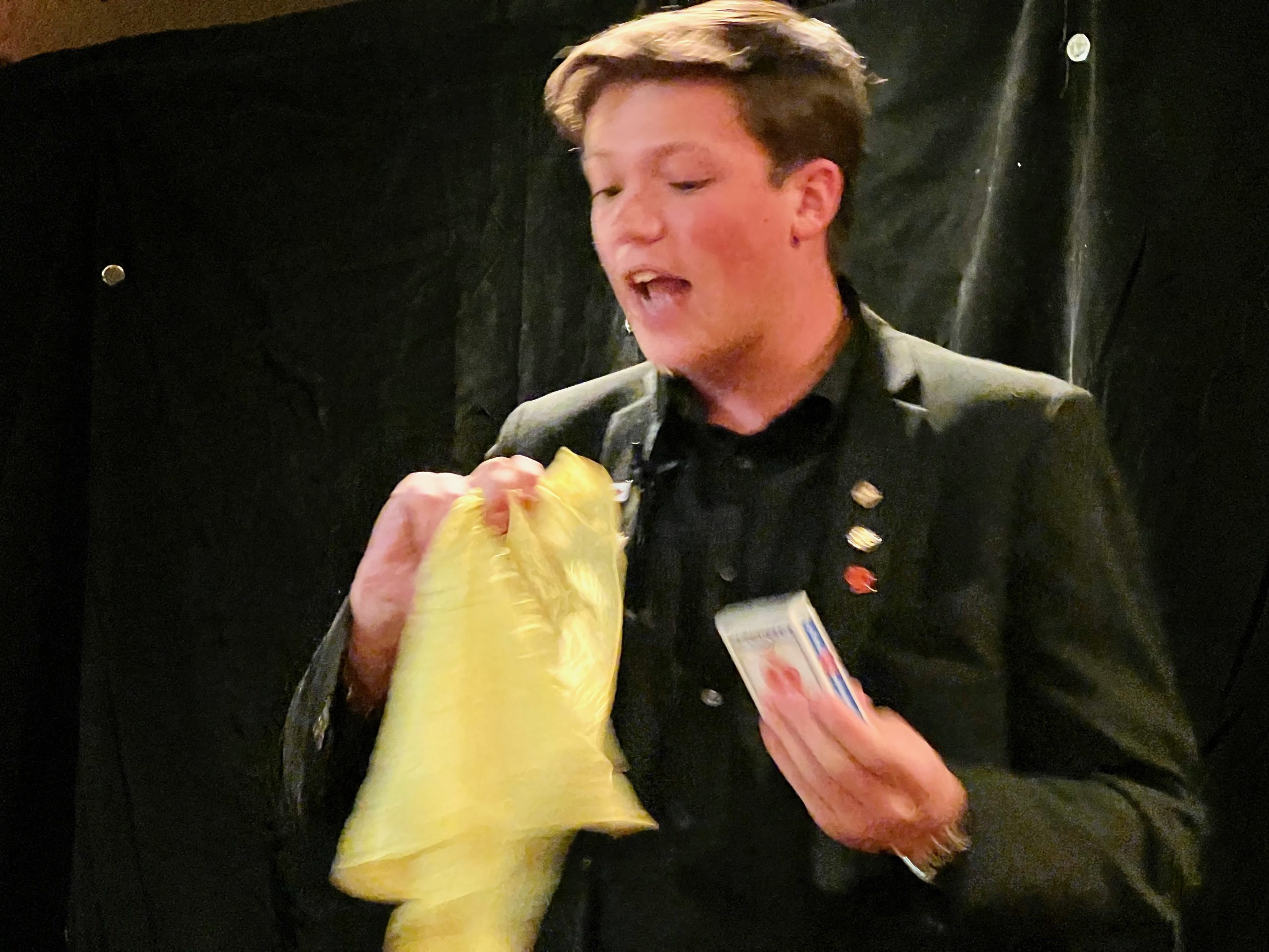 Next was Geno Ploeger, the 2019 IBM youth close-up champion and junior member of the Magic Castle, who started his energetic set with a conversation about doing magic on social media and illustrating it with color changing silks, culminating with a bottle production. Next were a couple cards effects, including a card stab through a paper bag, and then a glass of liquid appearing from the same bag.