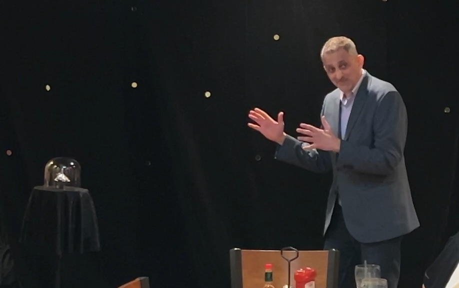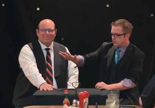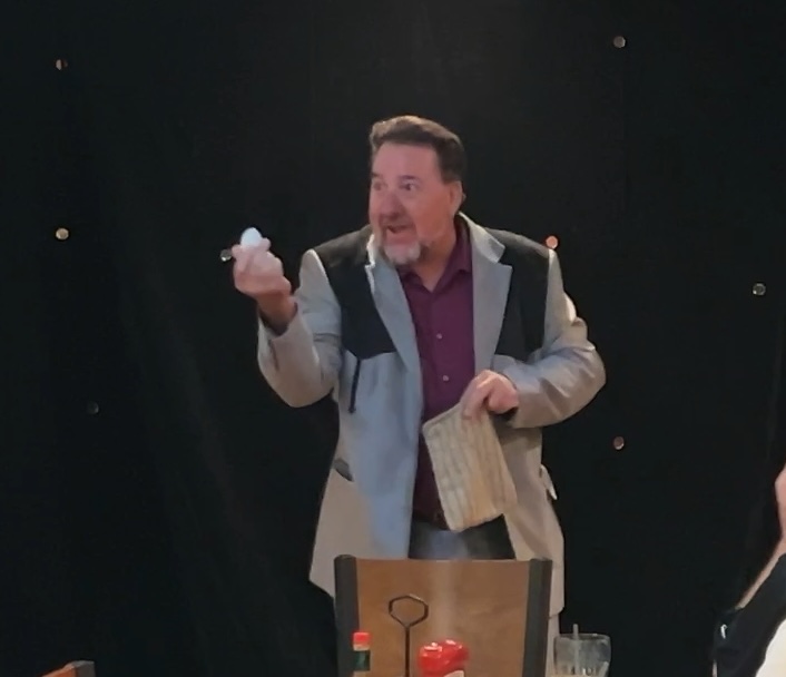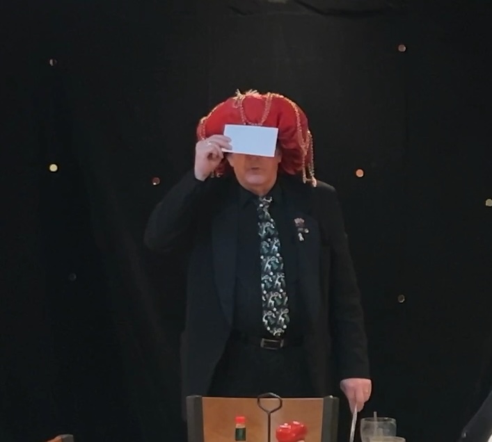 Club Secretary Jay Jennings was next with a version of Colin Cloud’s Safe Opener, but with an iced coffee as the load, and it just happened to match the kind that Jerry guessed ahead of time (caramel macchiato). As he was on the topic of drinks, Jay then performed a new routine called Mind on the Rocks where he mentally divined the names and special drinks that three spectators chose.