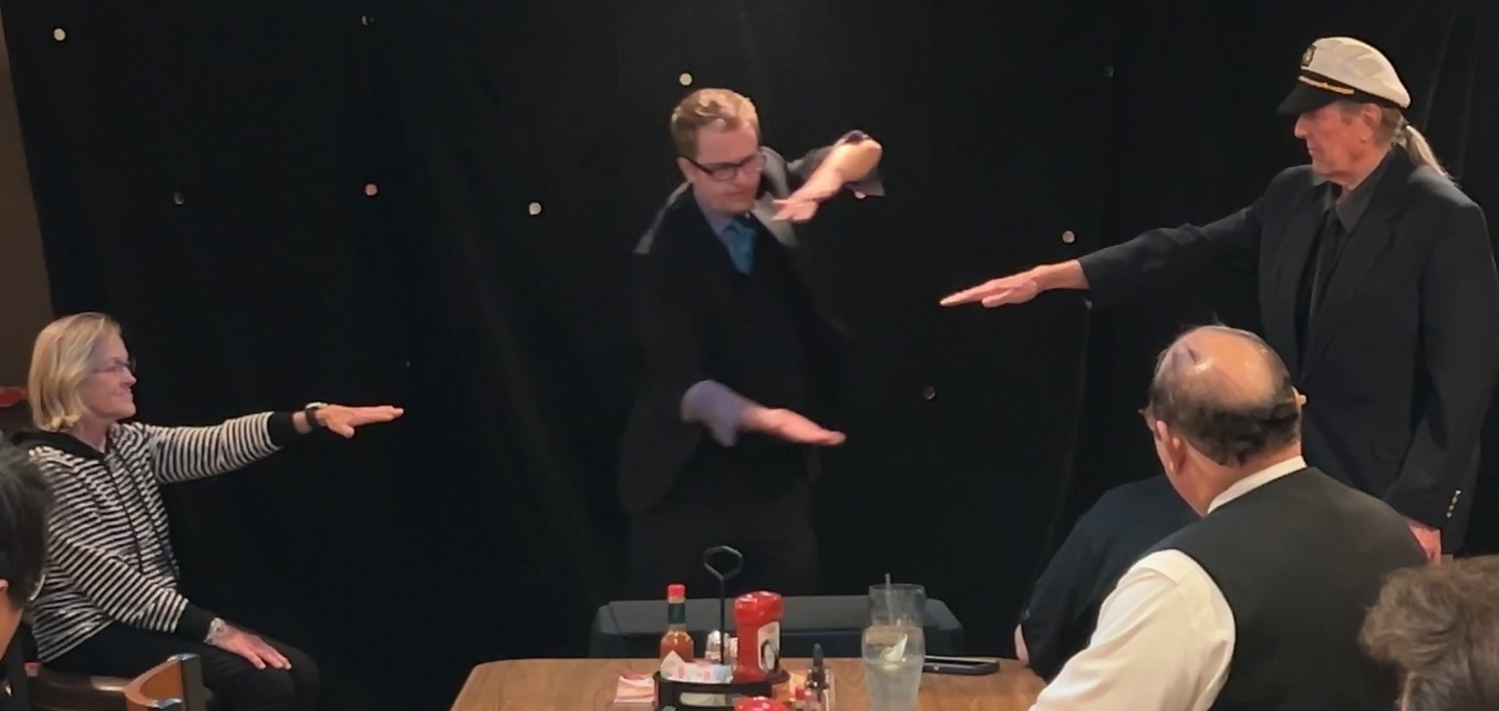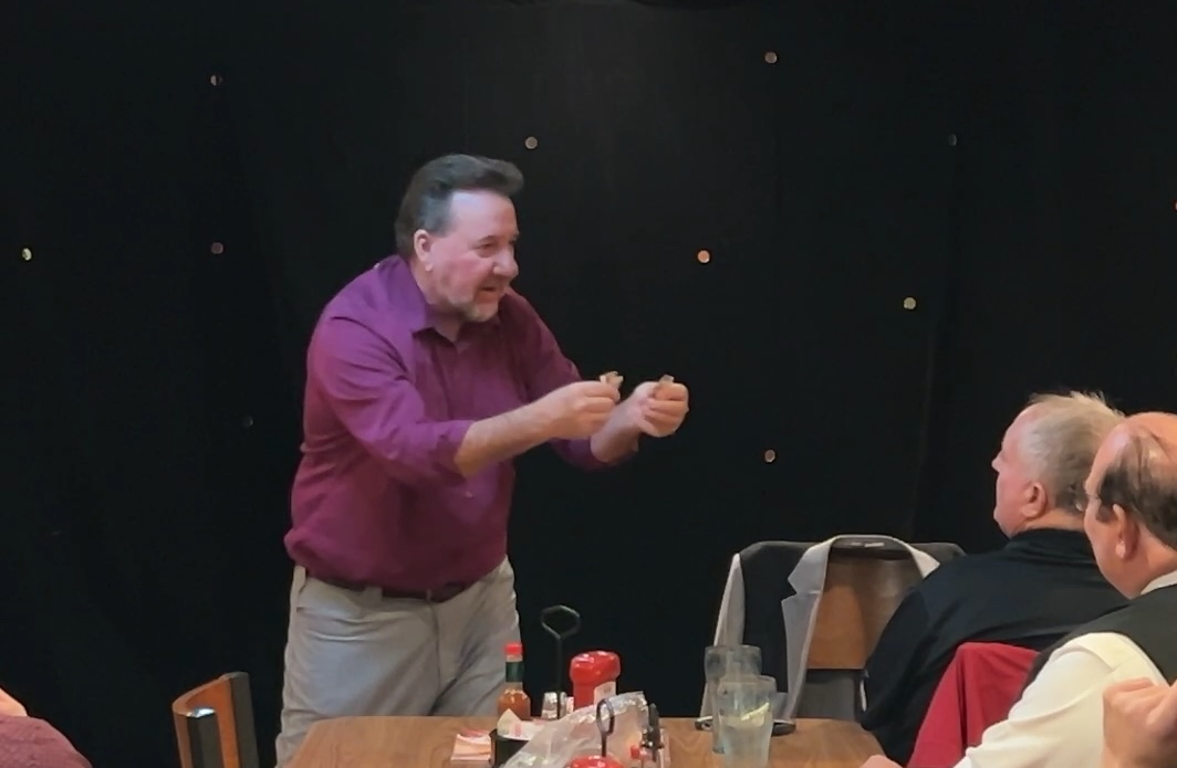 Club Secretary Jay Jennings was next with a version of Colin Cloud’s Safe Opener, but with an iced coffee as the load, and it just happened to match the kind that Jerry guessed ahead of time (caramel macchiato). As he was on the topic of drinks, Jay then performed a new routine called Mind on the Rocks where he mentally divined the names and special drinks that three spectators chose.