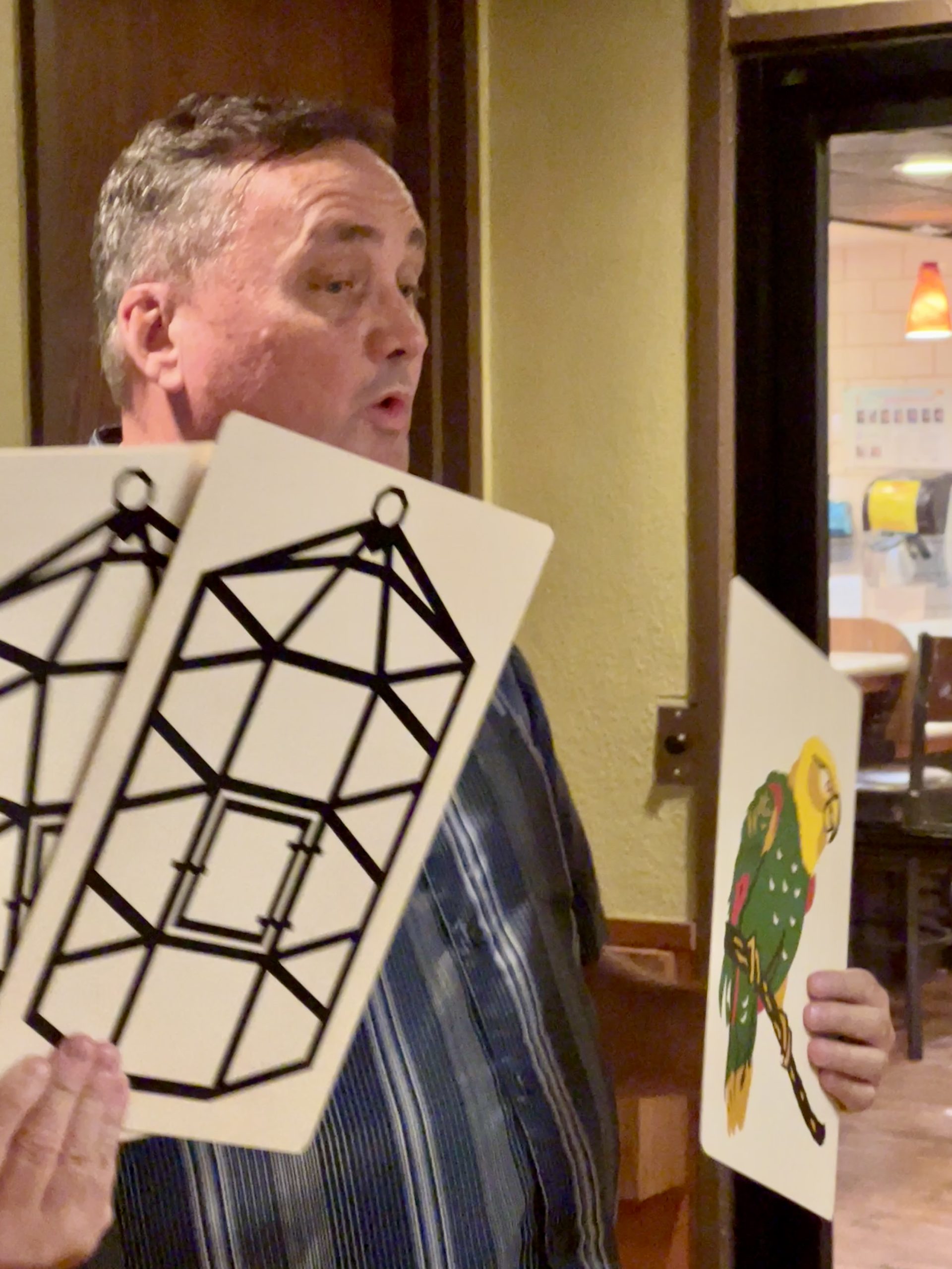 Club Treasurer Doug Northway brought Polly The Elusive Parrot that he had purchased from Sun Magic in Phoenix many years ago. He pulled Polly out of “magic storage” and told us the story of buying a parrot and some cages, and how Polly was able to escape from one cage after another. Fortunately, the effect ended with Polly safe in a cage and not flying free where a hawk could get her. (It happens, I’ve seen the videos.)
