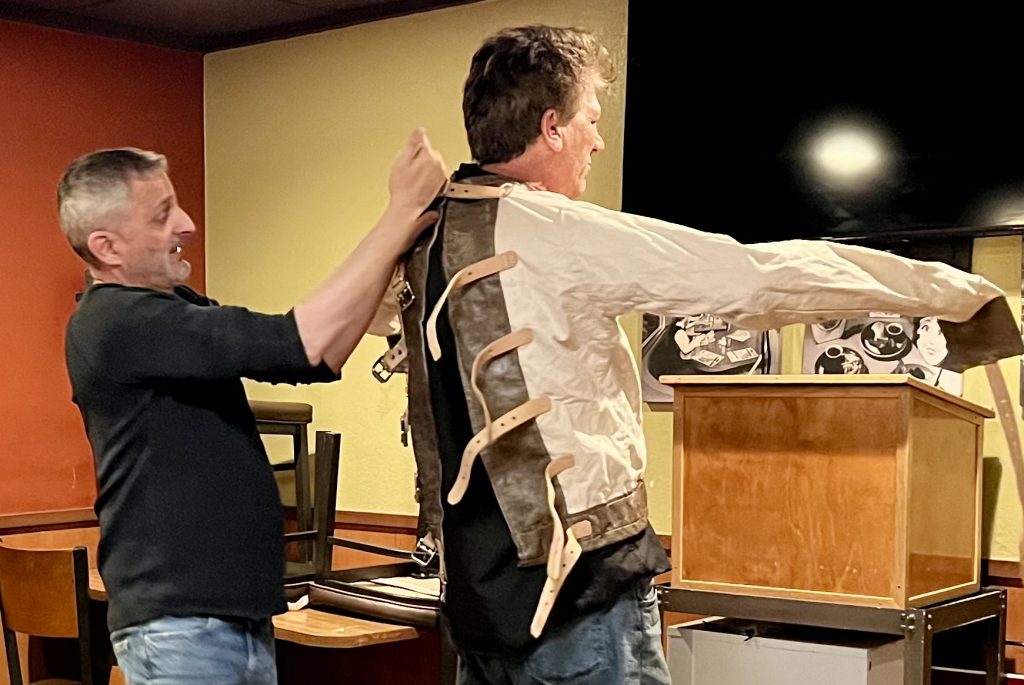 Club Treasurer Doug Northway performed Dani DaOrtiz’s Chaotic Oil and Water, but changed his presentation to “Salad Cards,” with his helpers throwing in some romaine, kale, spinach, and more. The second visitor to the club, Mystic Marlo, performed his straight jacket escape, and then Jeff Peterson closed out the performing time with some mind reading using a Sherlock Holmes Book Test (Zandman).