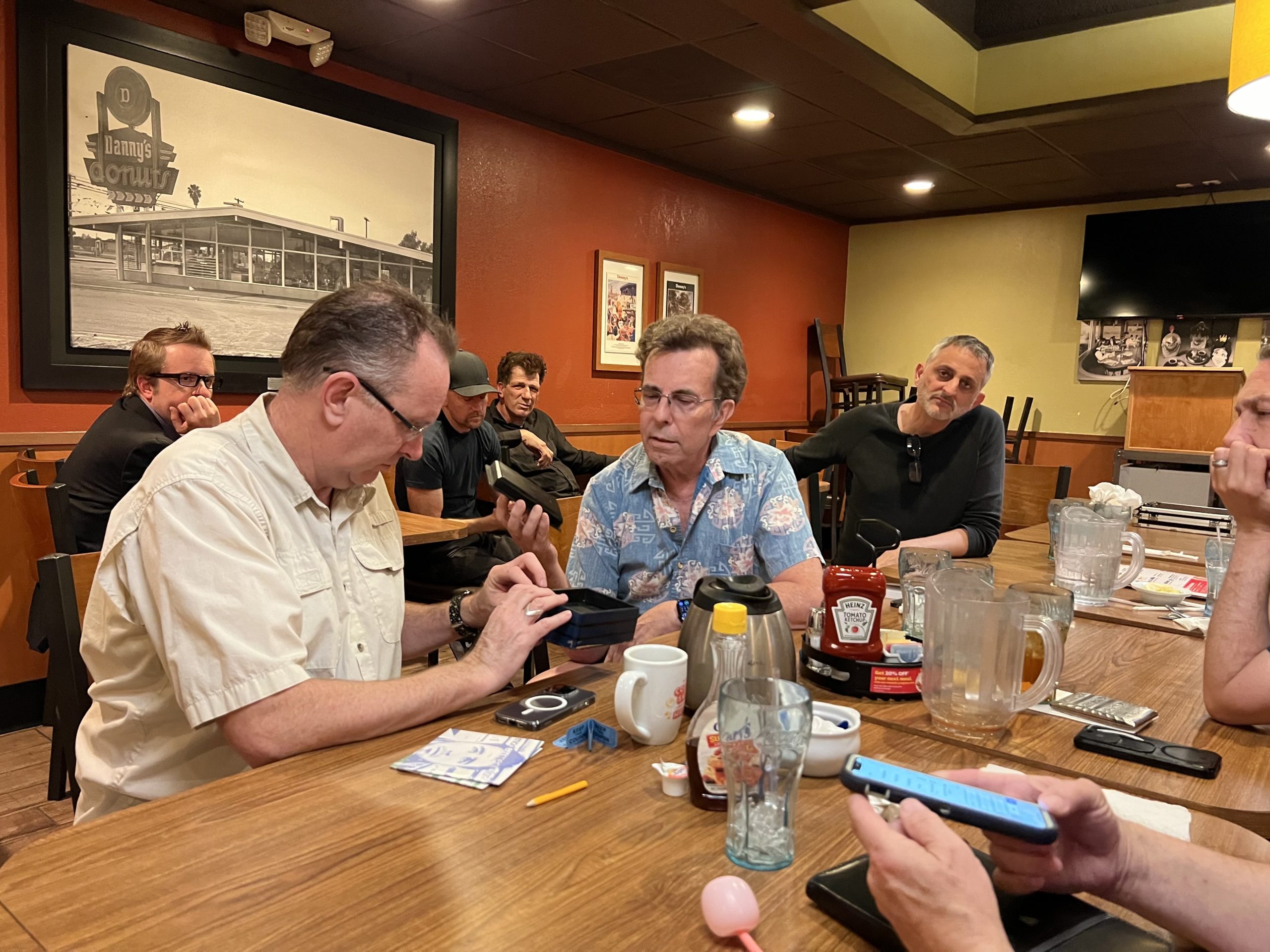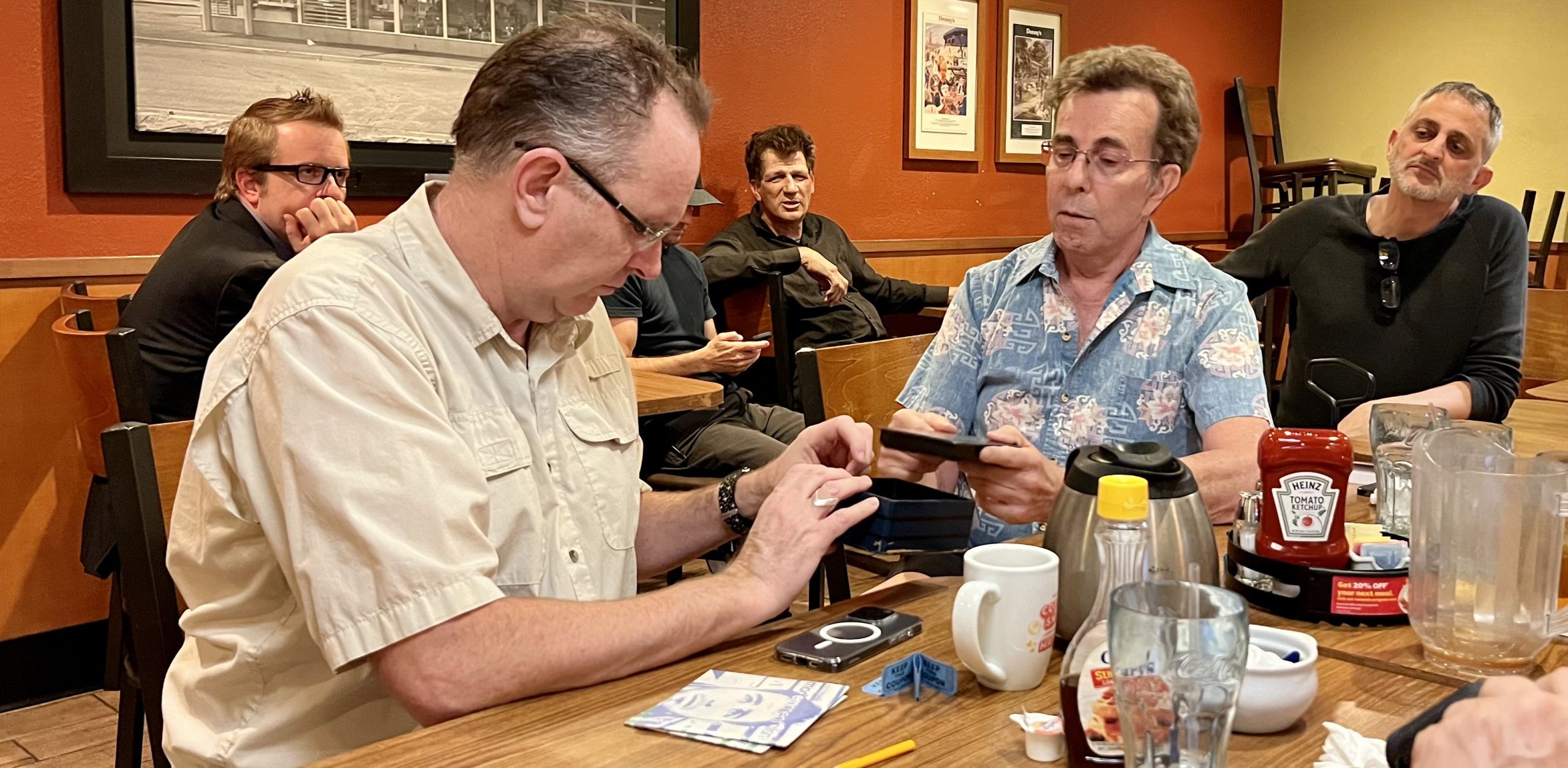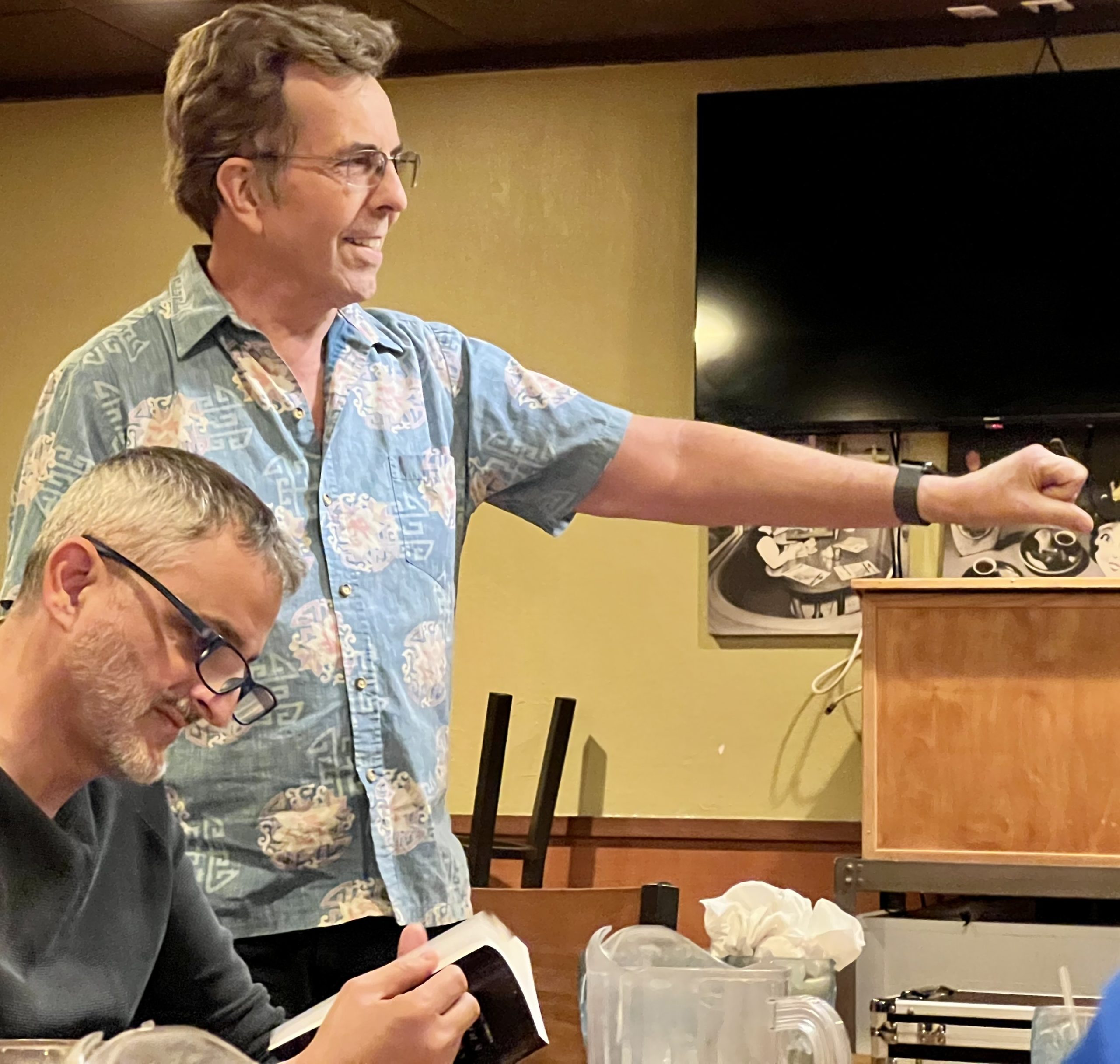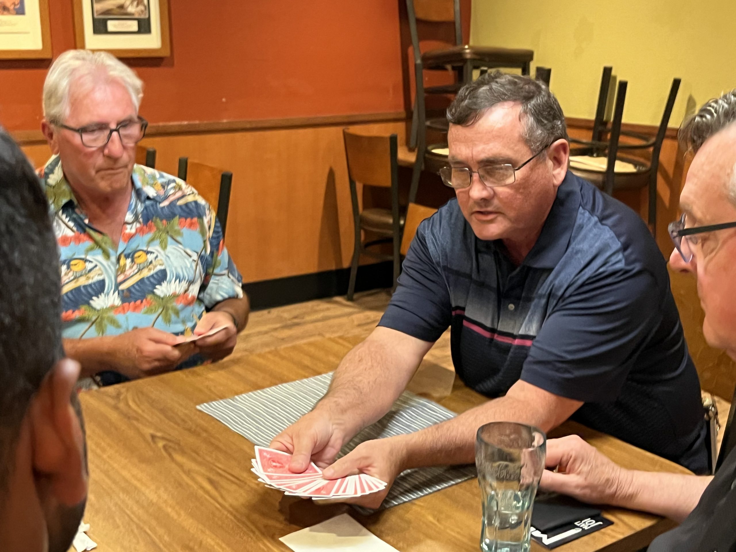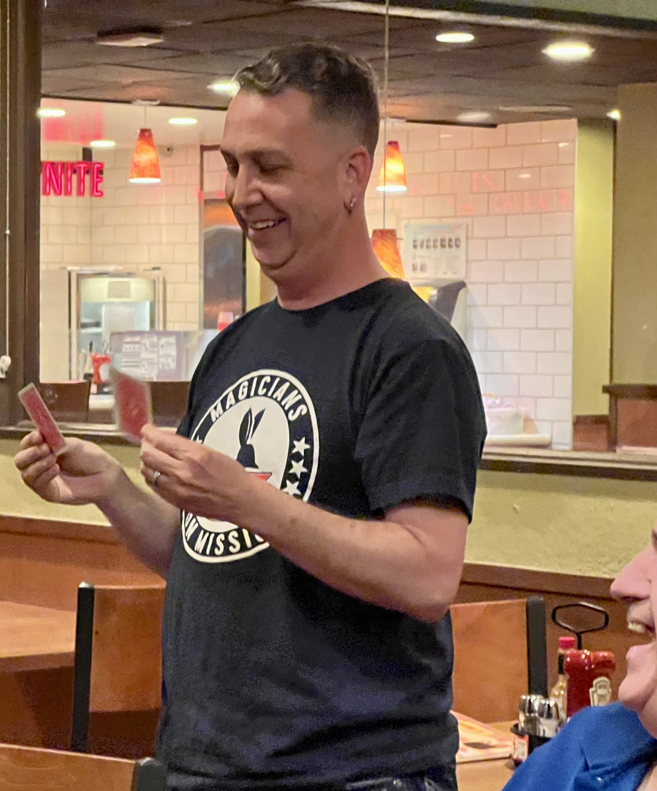 After the election we settled down to do some magic, with David Boehm leading off showing us Turn (Peter Pellikaan), a packet trick where the card fronts and backs kept changing. It sparked a discussion by members Chris Rose and Graham Rogers who suggested feedback to make the handling of the effect better when performing for a larger group. Outgoing President Robert Ray followed with some sleight of hand switching a $1 bill to $2.
