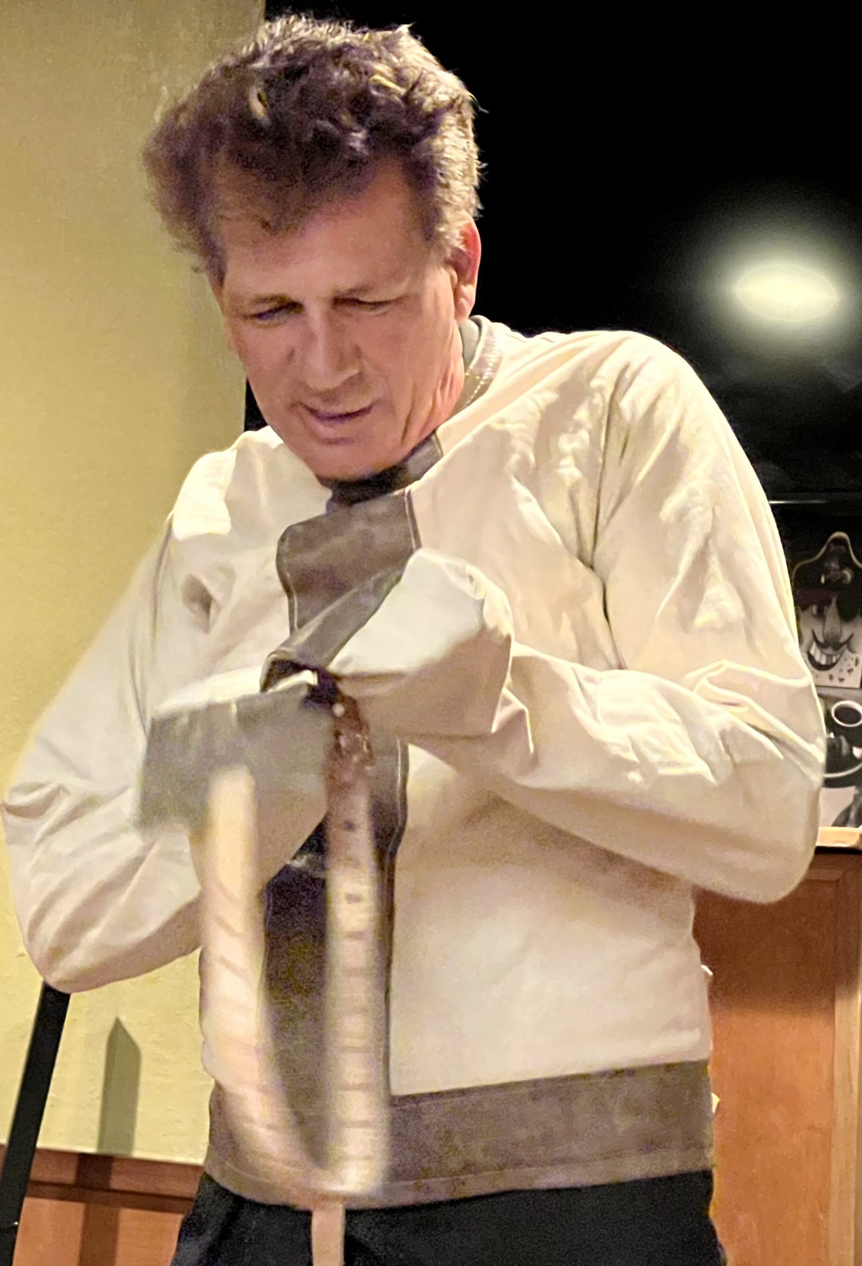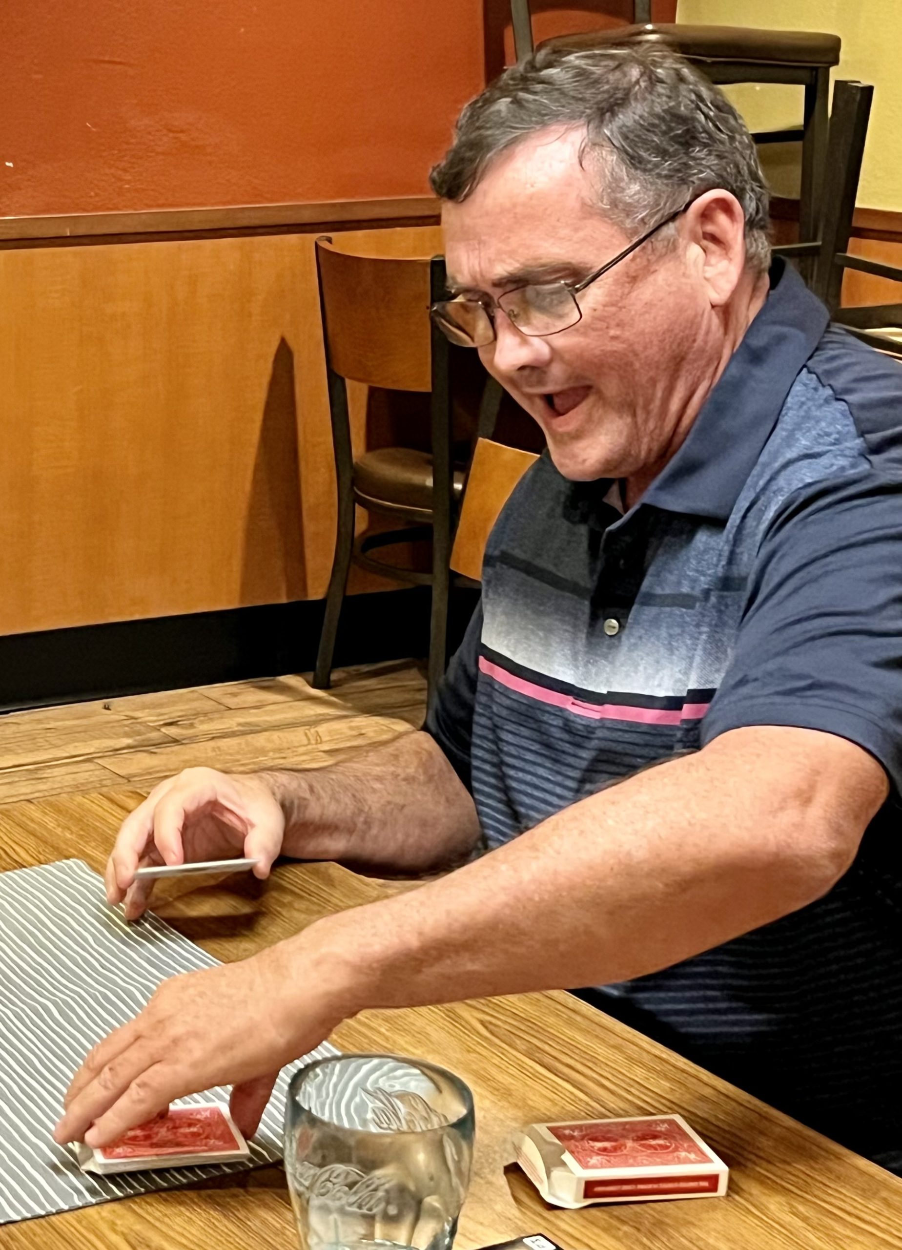 Club Treasurer Doug Northway performed Dani DaOrtiz’s Chaotic Oil and Water, but changed his presentation to “Salad Cards,” with his helpers throwing in some romaine, kale, spinach, and more. The second visitor to the club, Mystic Marlo, performed his straight jacket escape, and then Jeff Peterson closed out the performing time with some mind reading using a Sherlock Holmes Book Test (Zandman).