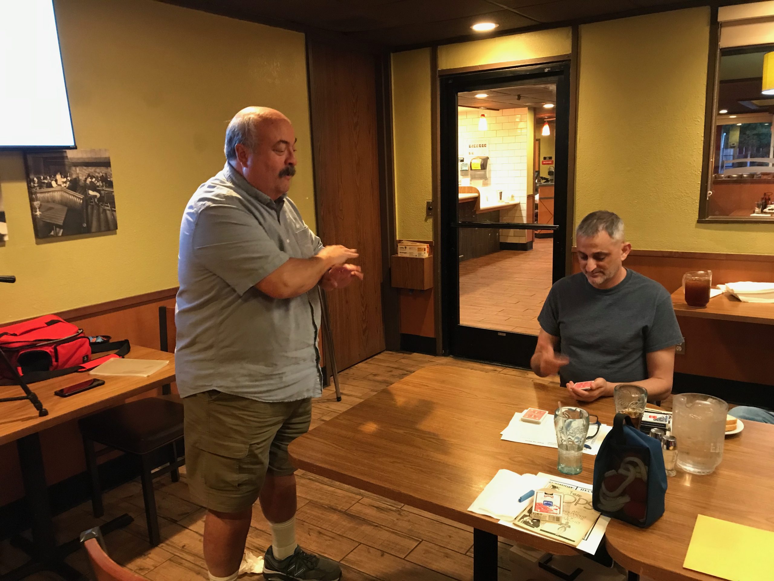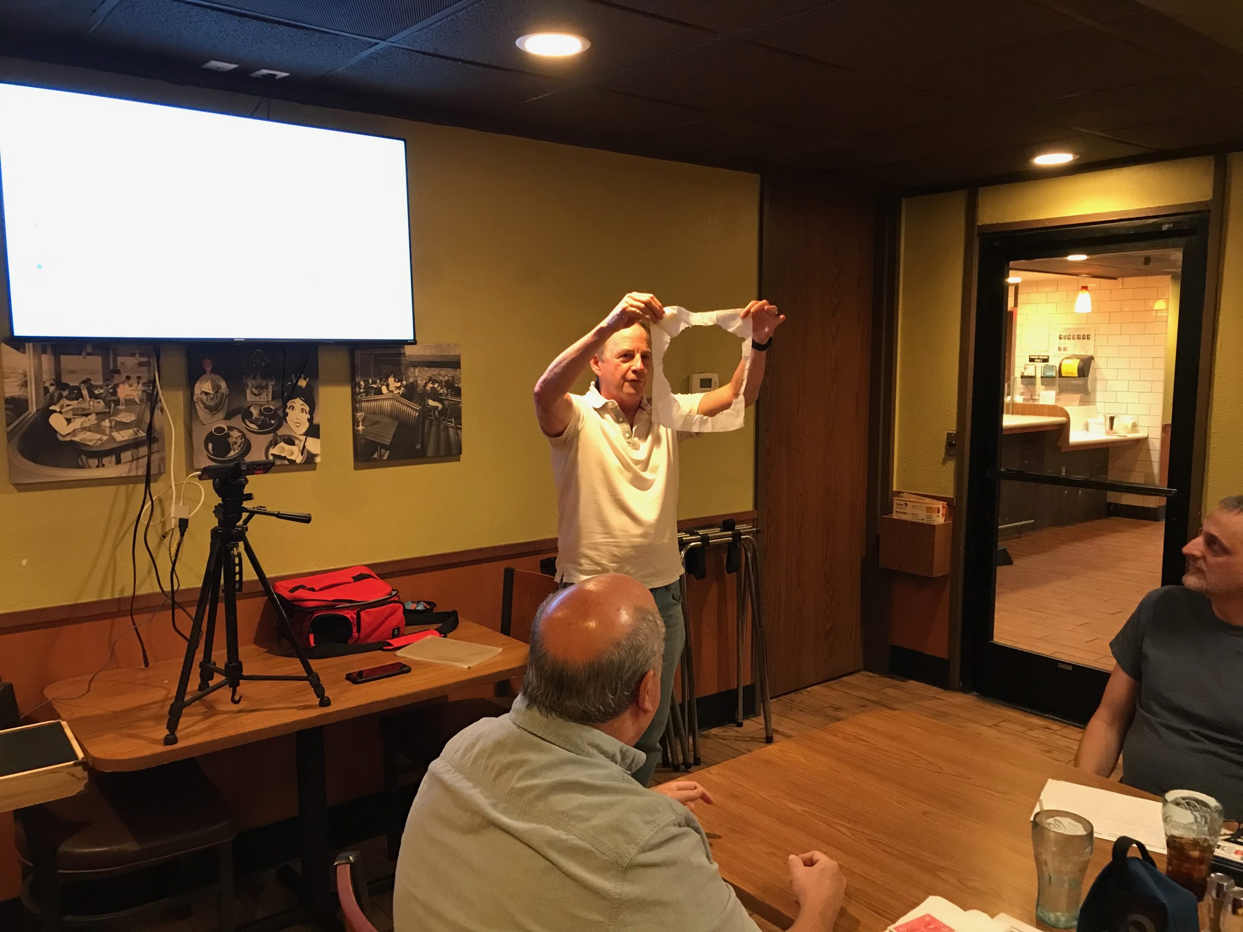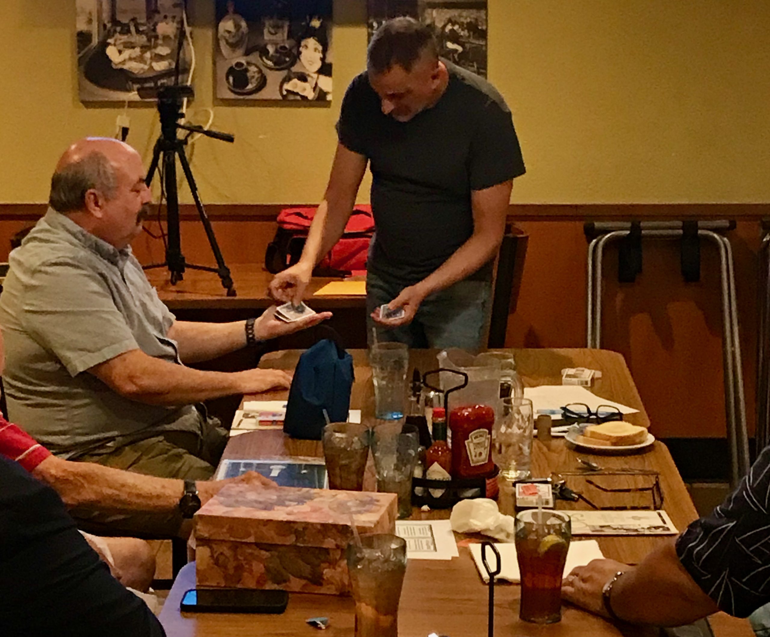 Guest Bob Firek started us off, not with an actual effect, but discussing some ideas for a character-driven performance as well as a card effect he came up with that he uses to quiet down any hecklers in the audience. Secretary Jay Jennings was next with an effect that started with a story about his dad, then cards with other “Dad Stories” were eliminated one by one. With only one card left, he ran out of time — but “luckily” the last card magically contained a picture showing the story he told at the beginning.