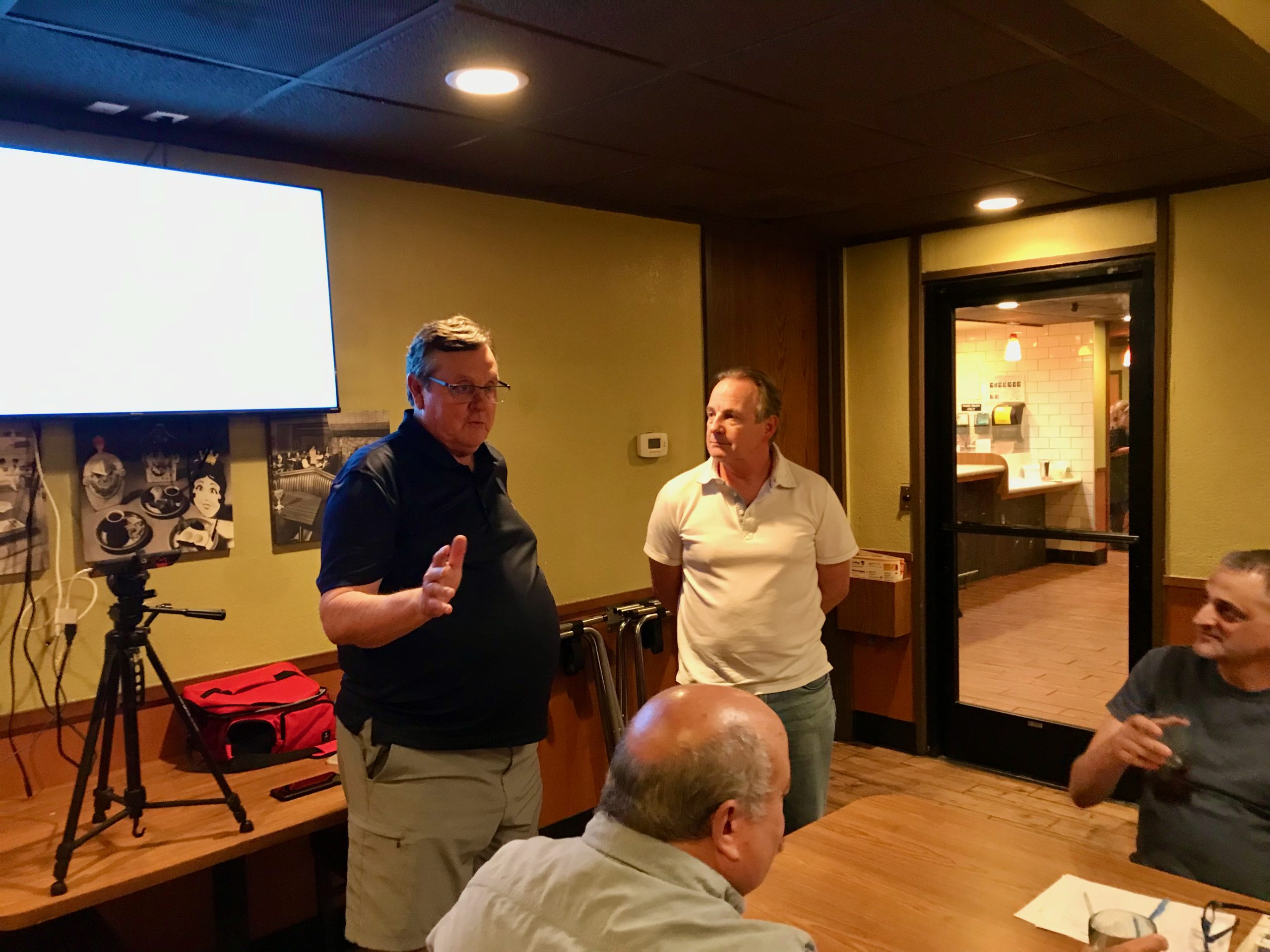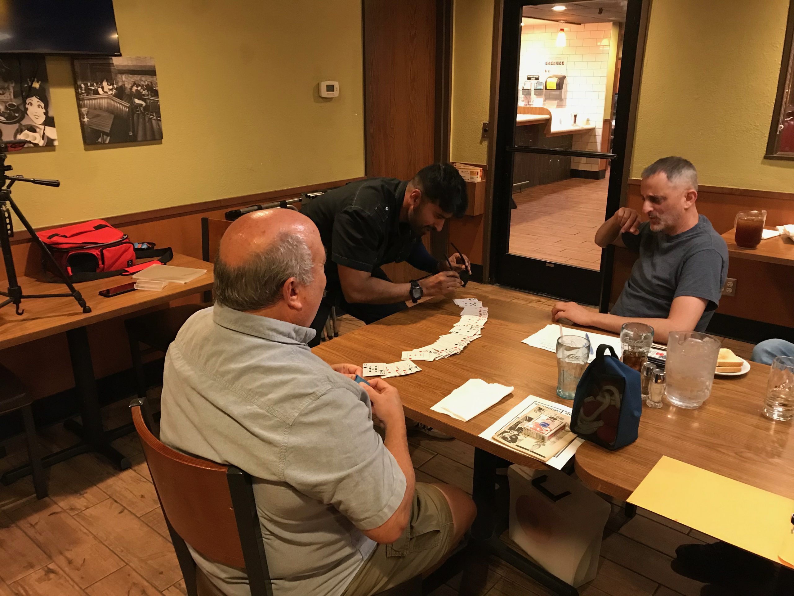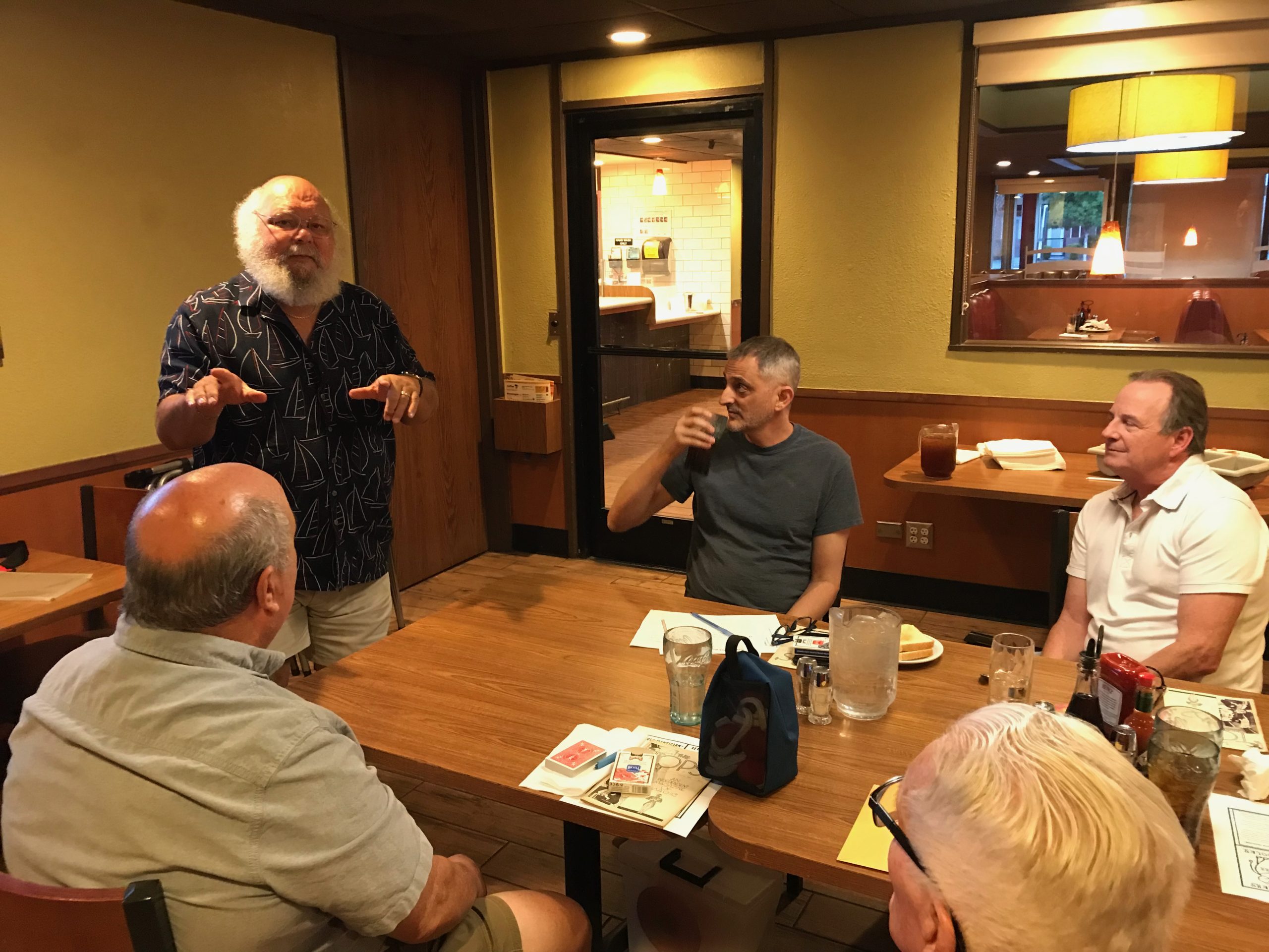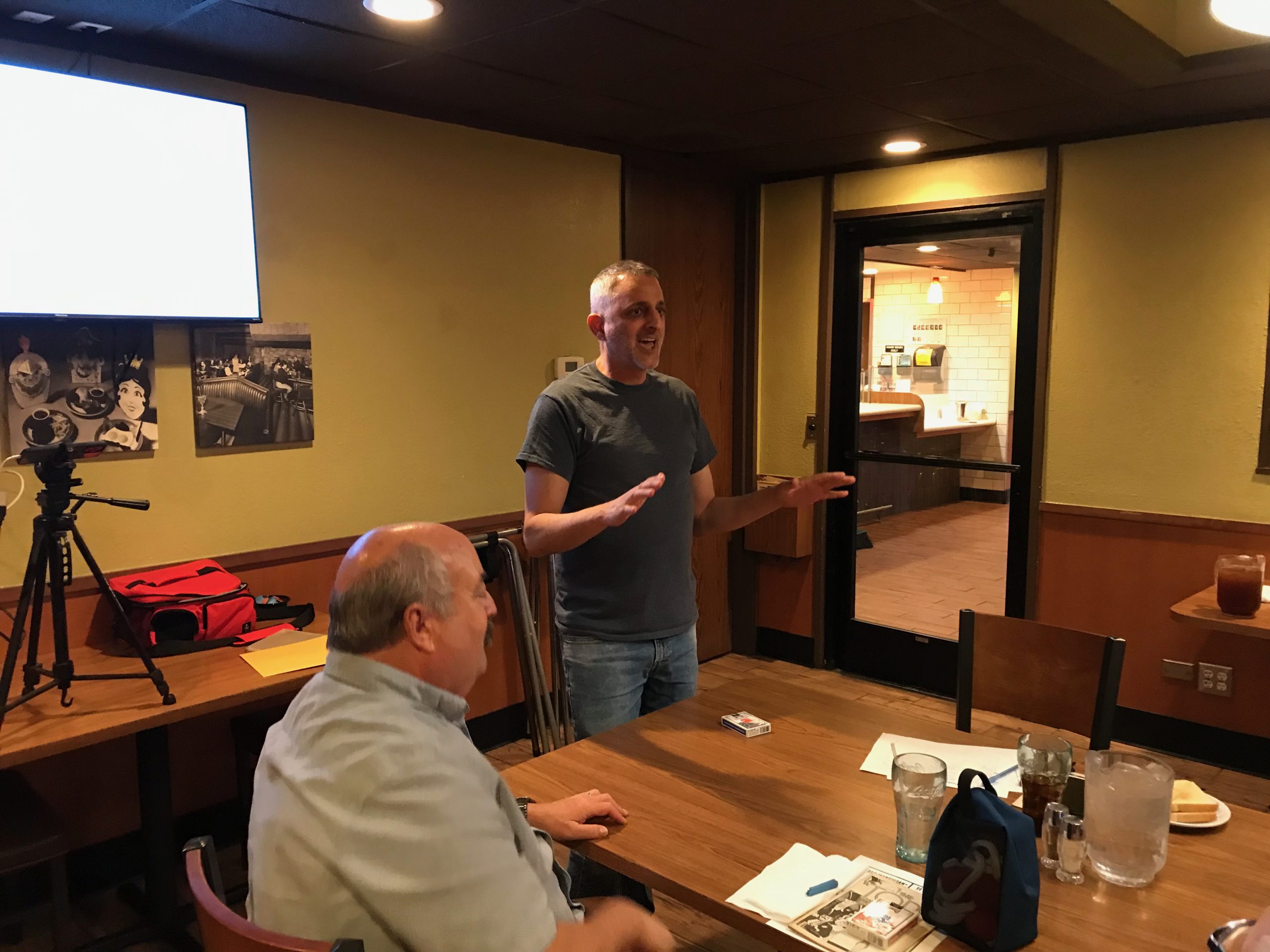 Guest Bob Firek started us off, not with an actual effect, but discussing some ideas for a character-driven performance as well as a card effect he came up with that he uses to quiet down any hecklers in the audience. Secretary Jay Jennings was next with an effect that started with a story about his dad, then cards with other “Dad Stories” were eliminated one by one. With only one card left, he ran out of time — but “luckily” the last card magically contained a picture showing the story he told at the beginning.