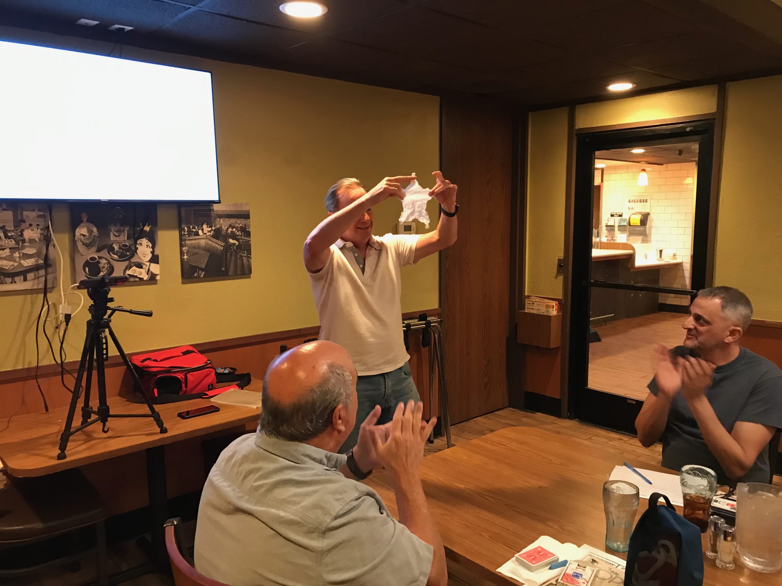 Our next performer, Bill Halmi, took a napkin and showed us the moon and a star, performing Dan Harlan’s Starcle (seeing it is so much better than just reading about it). Past President David Goldberg got us all laughing with his rendition of John Bannon’s No No No No No No No Maybe Yes card effect.