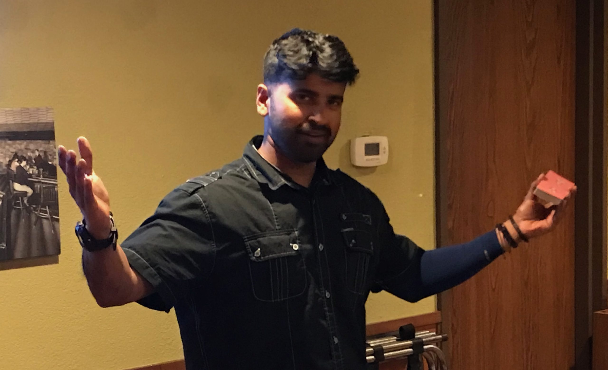Vice President David Boehm performed Max Maven’s Pocket Nightmare. Andy’s father told him not to do card tricks, so he showed us a card trick. Using some cool-looking sunglasses he was able to find a chosen card using the heat from the helper’s hand. (That quite possibly wasn’t the actual science/magic behind the effect, but it was good nonetheless.)